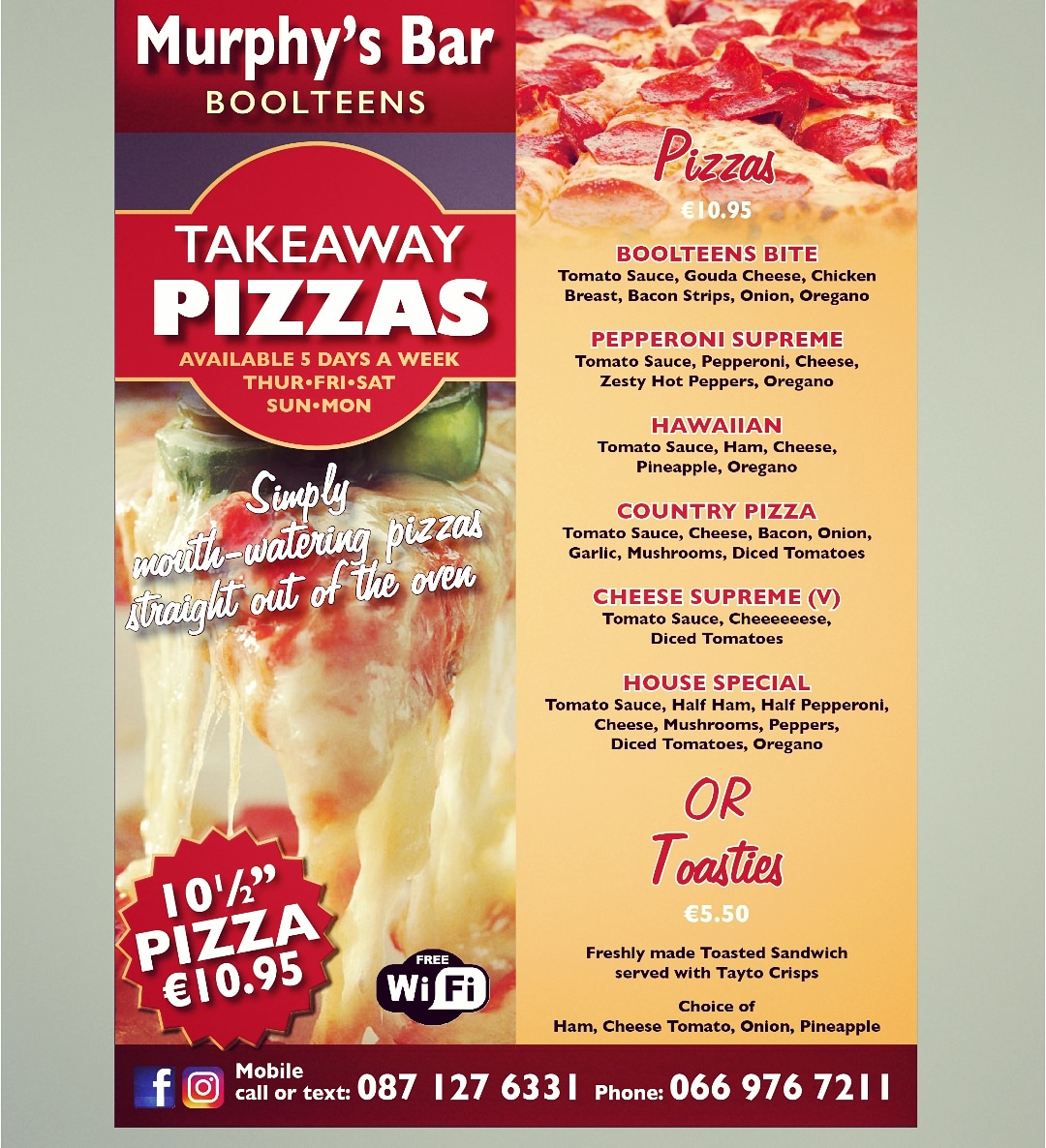 Murphy’s Bar has a limited yet tasty pub menu – simply 10.5” PIZZAs or homemade sandwiches/toasties. Serving PIZZAs to GO too! Just give us a call on 0871276331.
